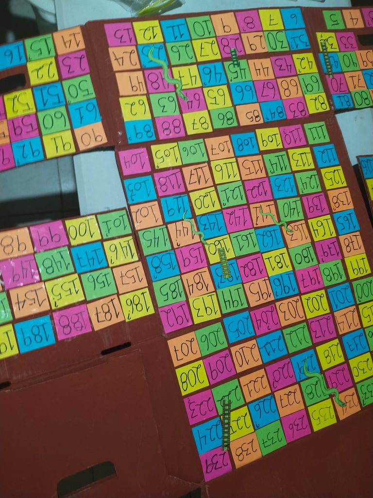 En la semana de exámenes hicimos un juego "serpientes y escaleras" con una caja y hojas de colores también ocupamos preguntas para los retos que tenia el juego